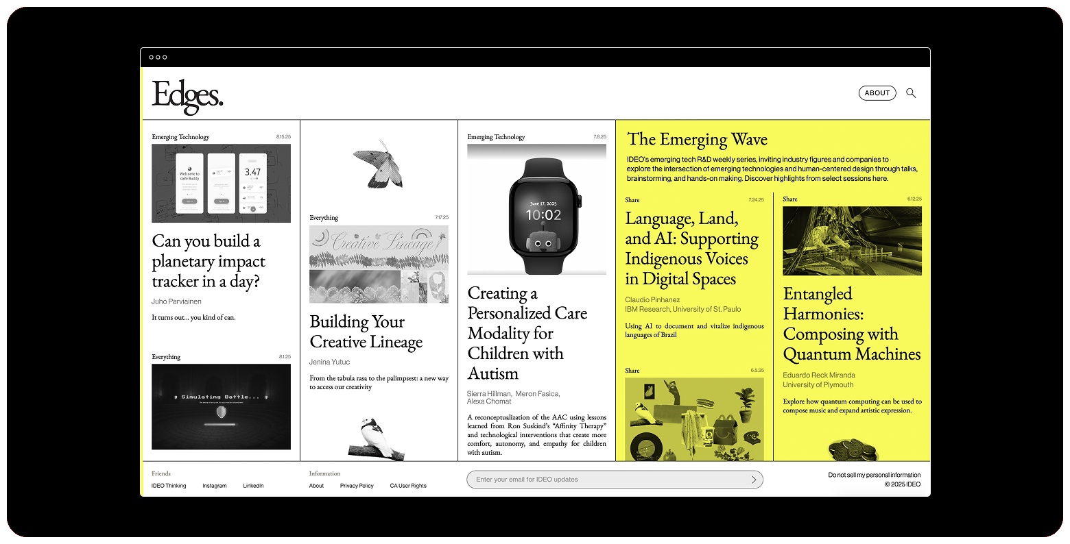Edges is an online platform for experiments, essays and conversations existing at the edge of craft. Intended to be a space celebrating craft and tech in equal measure, it was designed to emulate a broadsheet newspaper with scrollable columns – infusing tactility. Throughout the site are randomized (and interactive) “scraps” sourced from IDEOers, giving the feeling of a messy, creative workspace.